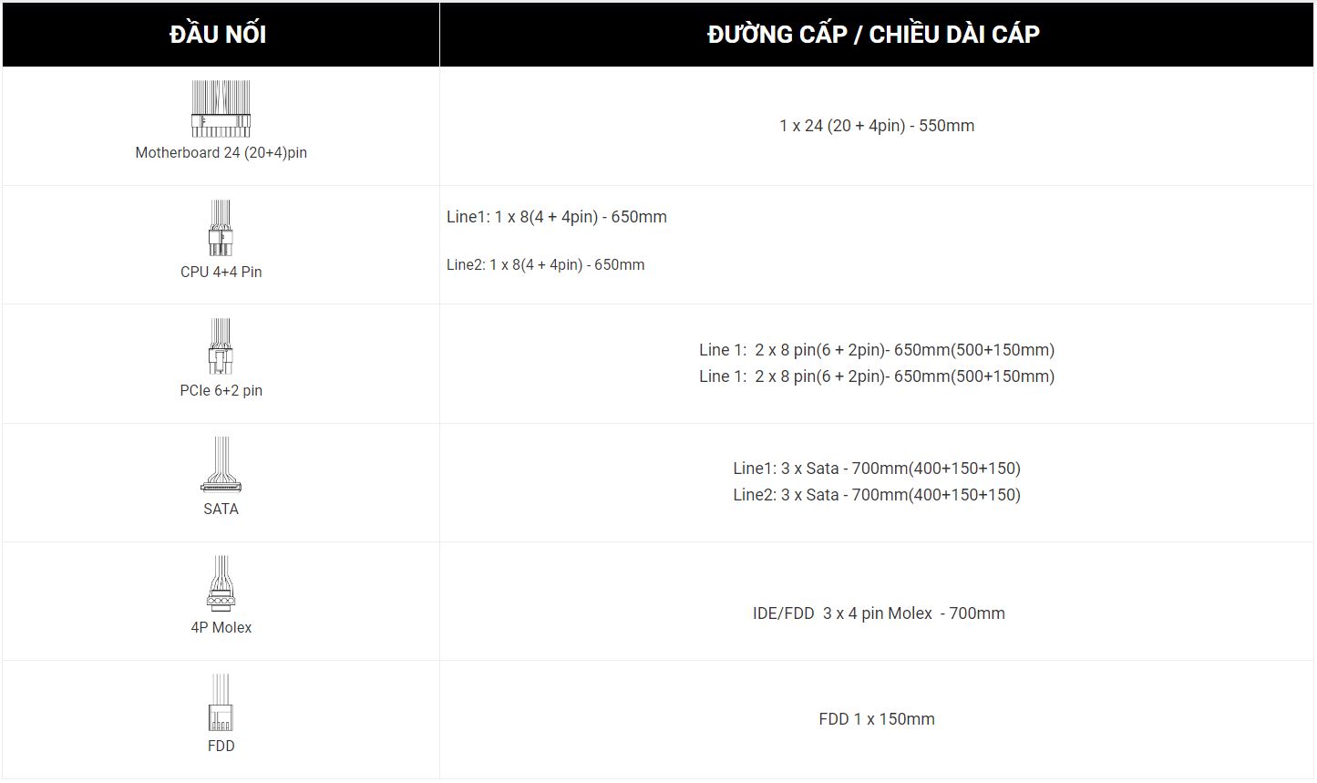+ Mainboard: 1 x 24 (20+4pin) - 550mm