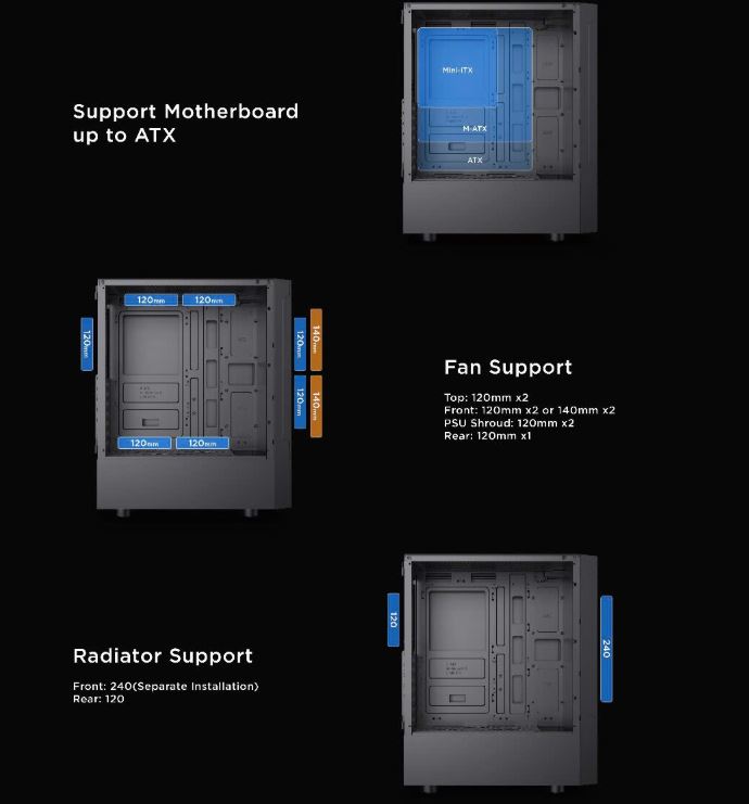 - Hỗ trợ Mainboard: ATX, Micro-ATX, ITX